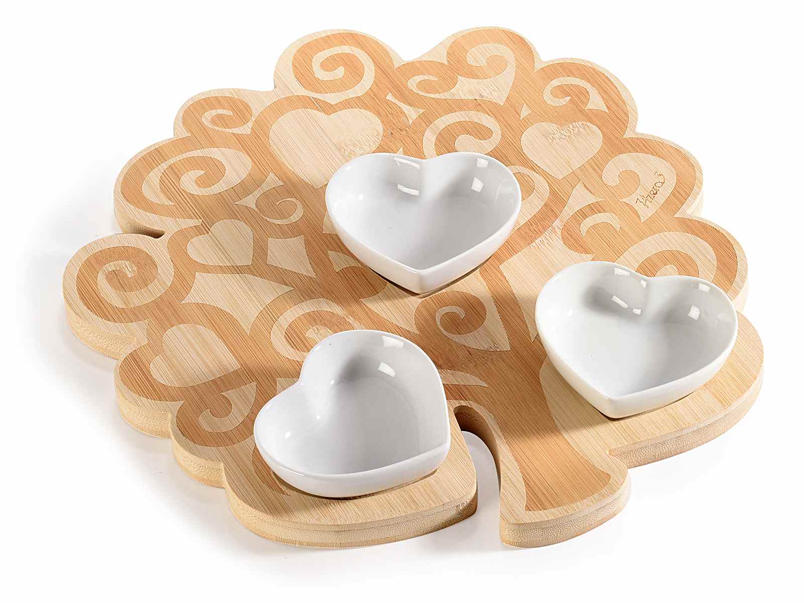Set aperitivo 3 coppette in porcellana su vassoio in legno