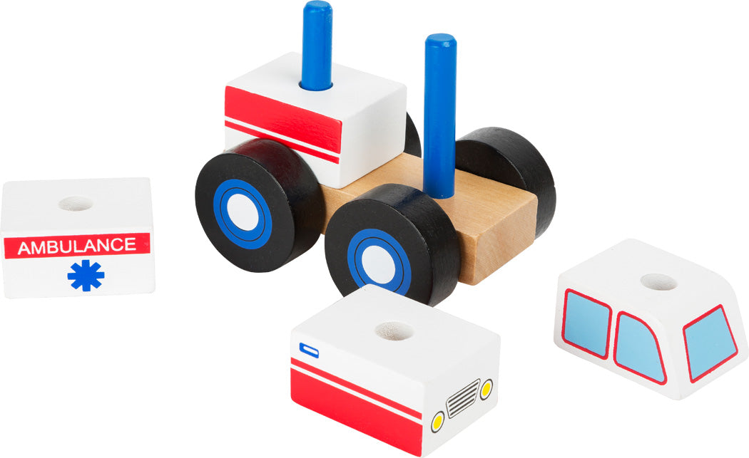 Bisogna incastrare i vari blocchi colorati in legno nella sequenza corretta in modo tale ottenere un ambulanza.