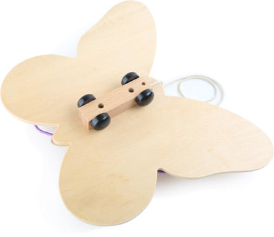 Questa bellissima farfalla in legno da trainare allena le capacità motorie dei bambini.