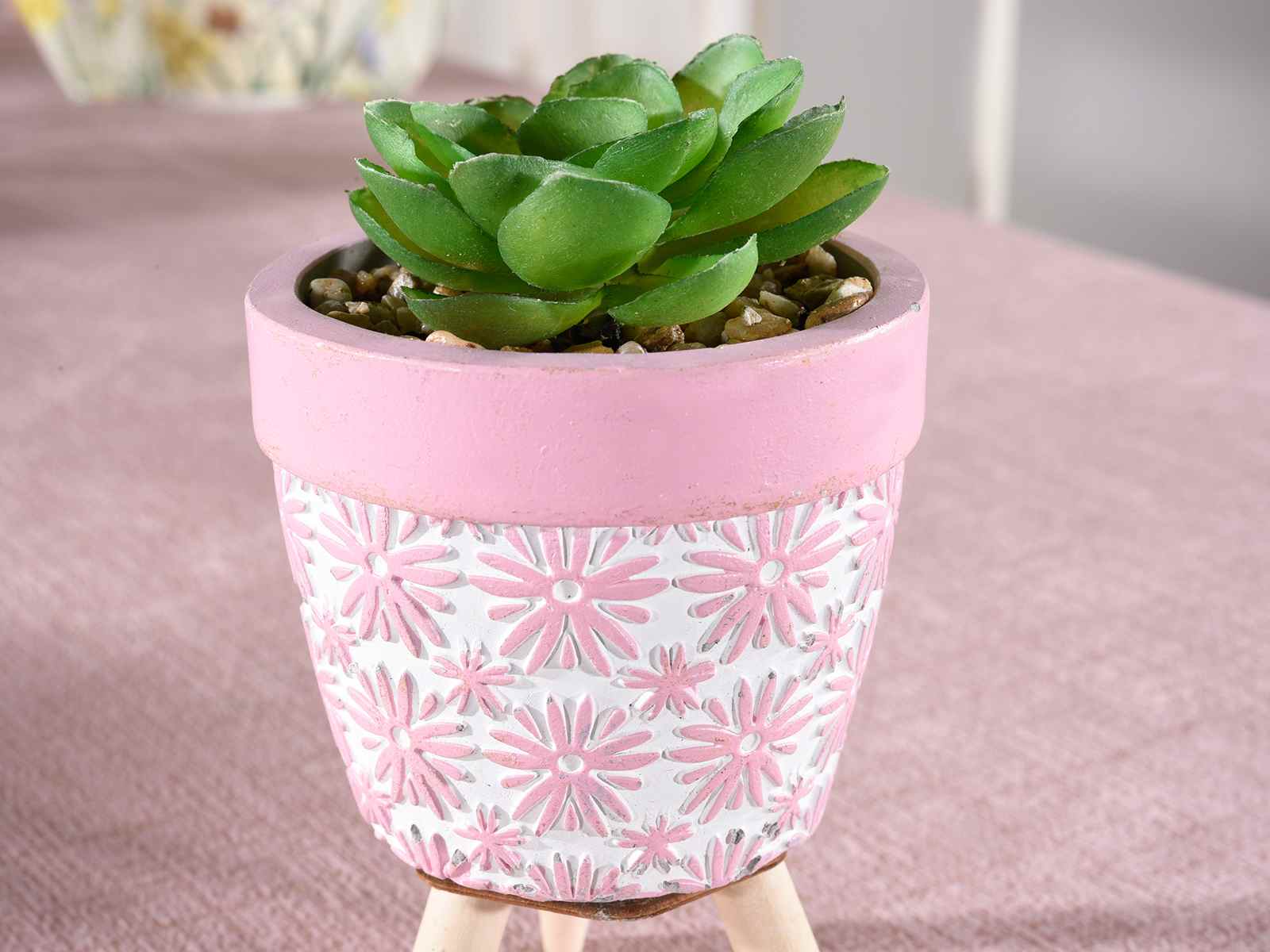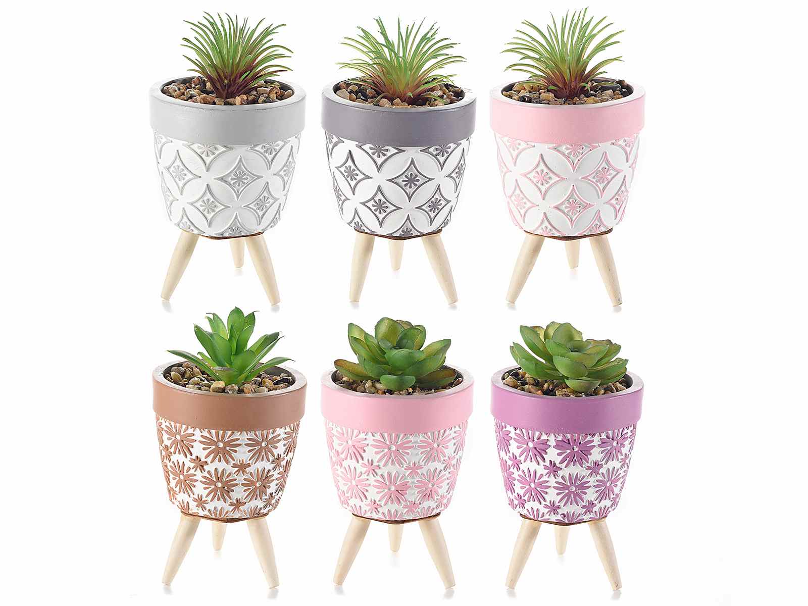Vasi in cemento decorato con piante artificiali e treppiede in legno